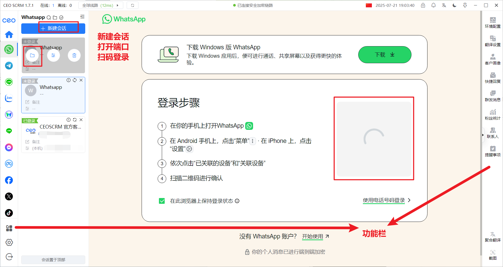 员工安装桌面端（参考准备工作），然后通过老板给的激活码，登录需要引流的账号，以TG账号为例，点击 【新建会话】 →，点击配置代理（看需求，默认不配置IP的话试用本地IP），手机扫码登录TG账号，进入账号聊天页面，说明登号成功。（其他平台操作相同）
