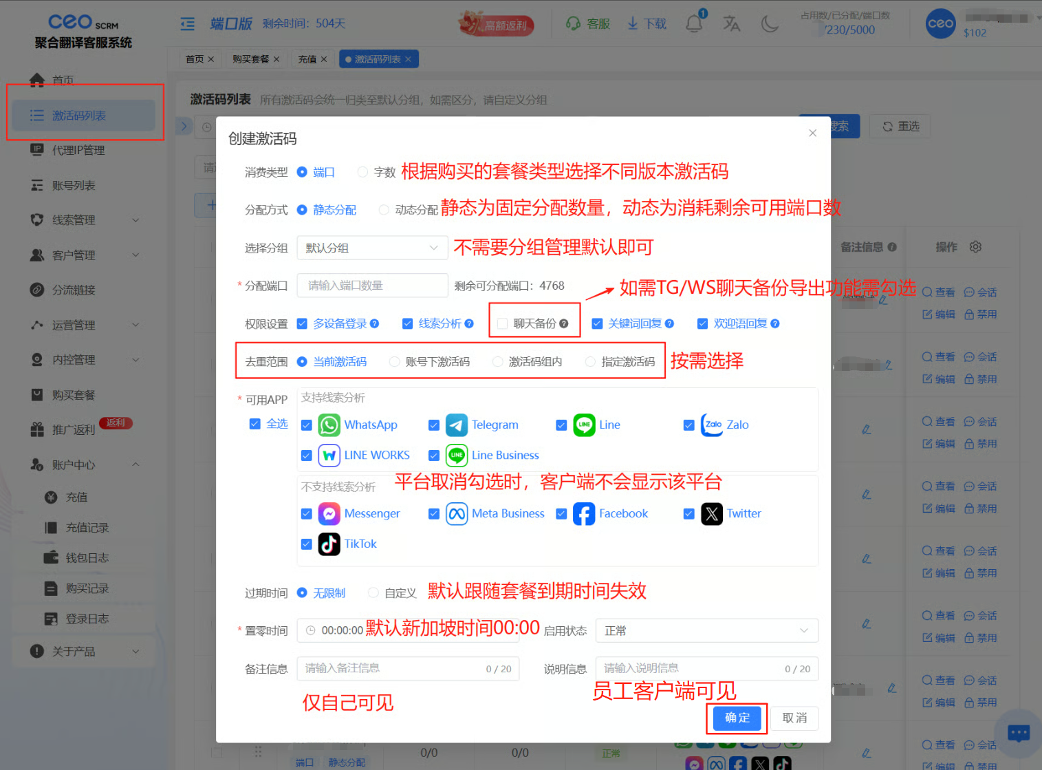 老板先登录系统主管端，然后点击【激活码列表】，点击【新建激活码】，进入弹窗，根据需求，完成相关设置（如果想要快速投入使用，只需填写备注信息，其他选择默认即可），创建完激活码后，将激活码、桌面端下载网址发给员工。
