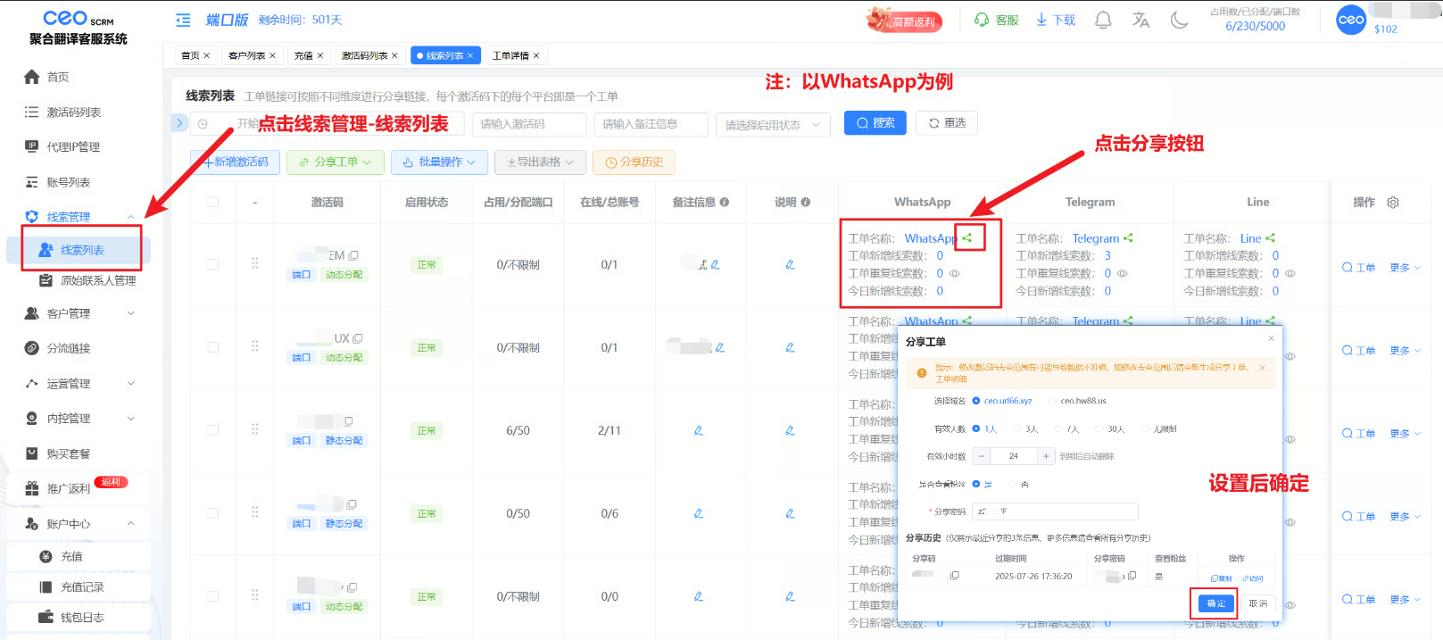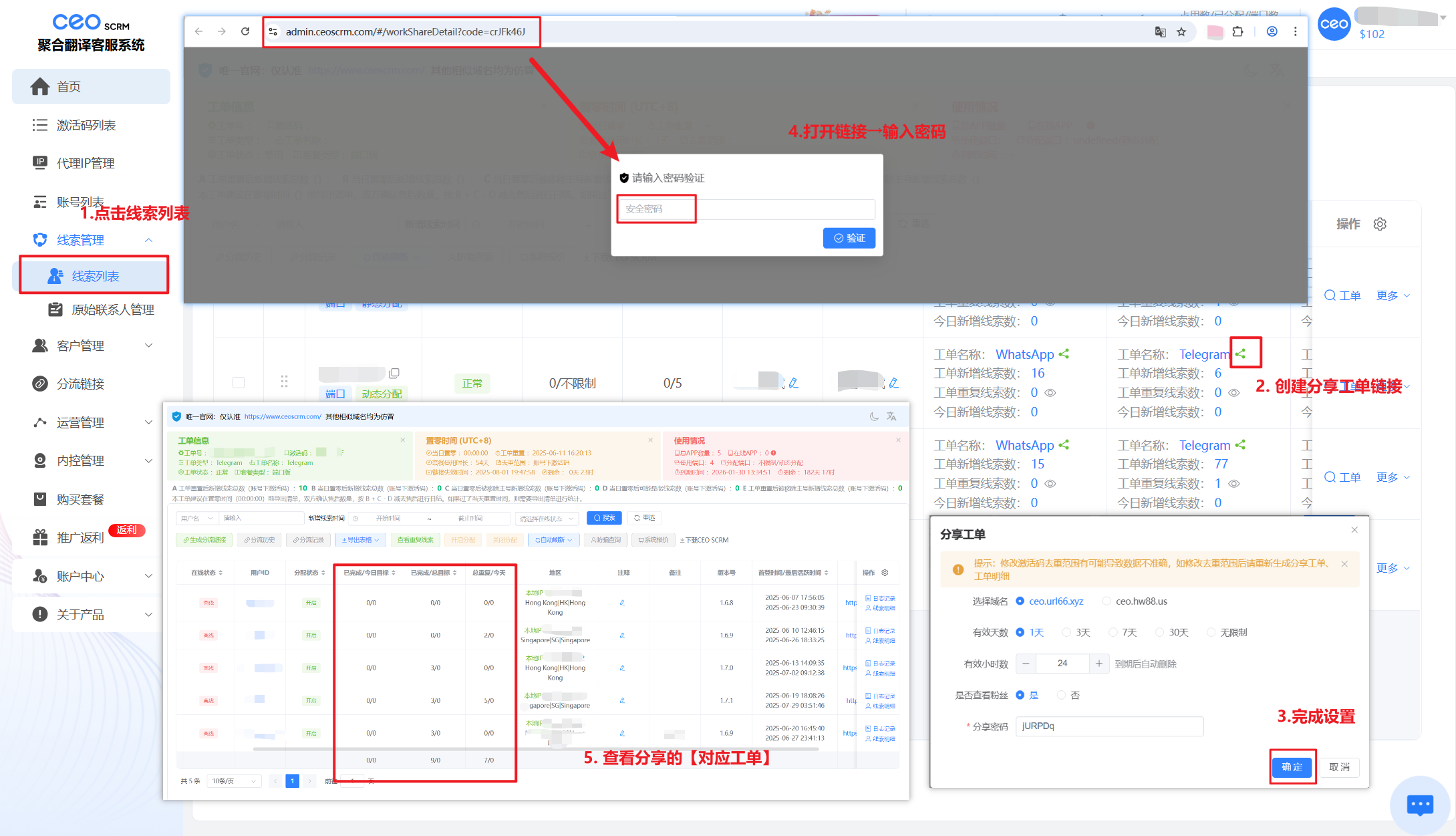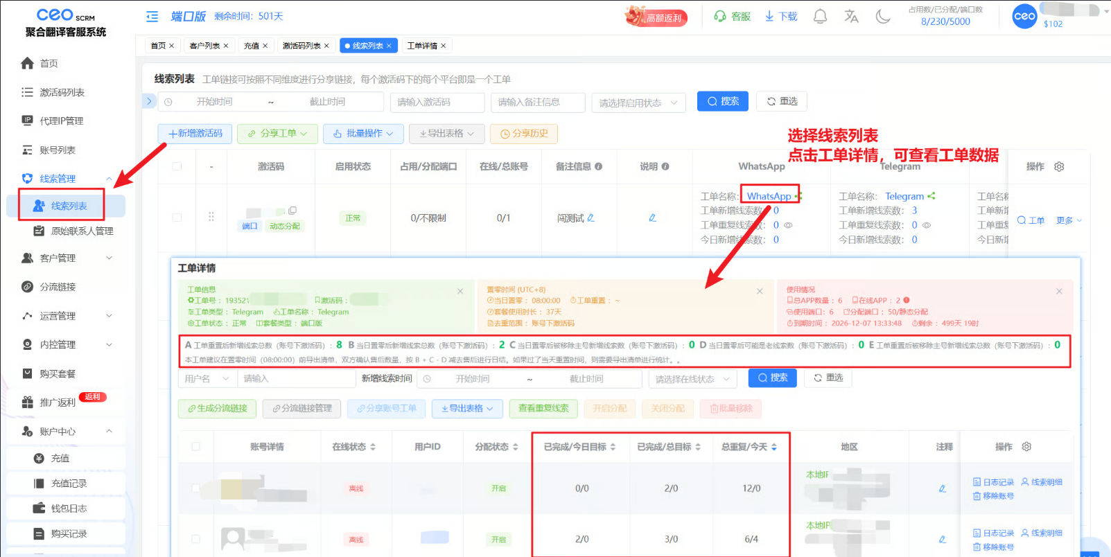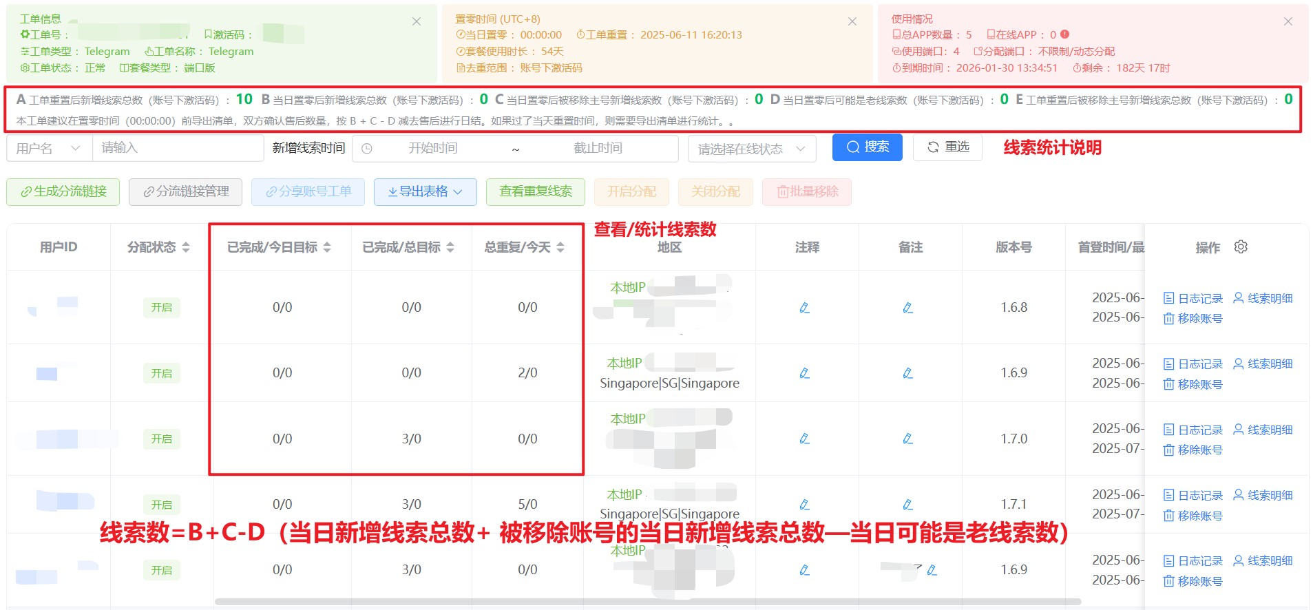 打开 【 线索列表 】 ，找到对应激活码【工单名称】→点击分享按钮（这里以Telegram为例）→打开工单数据报表的链接→查看账号的线索数