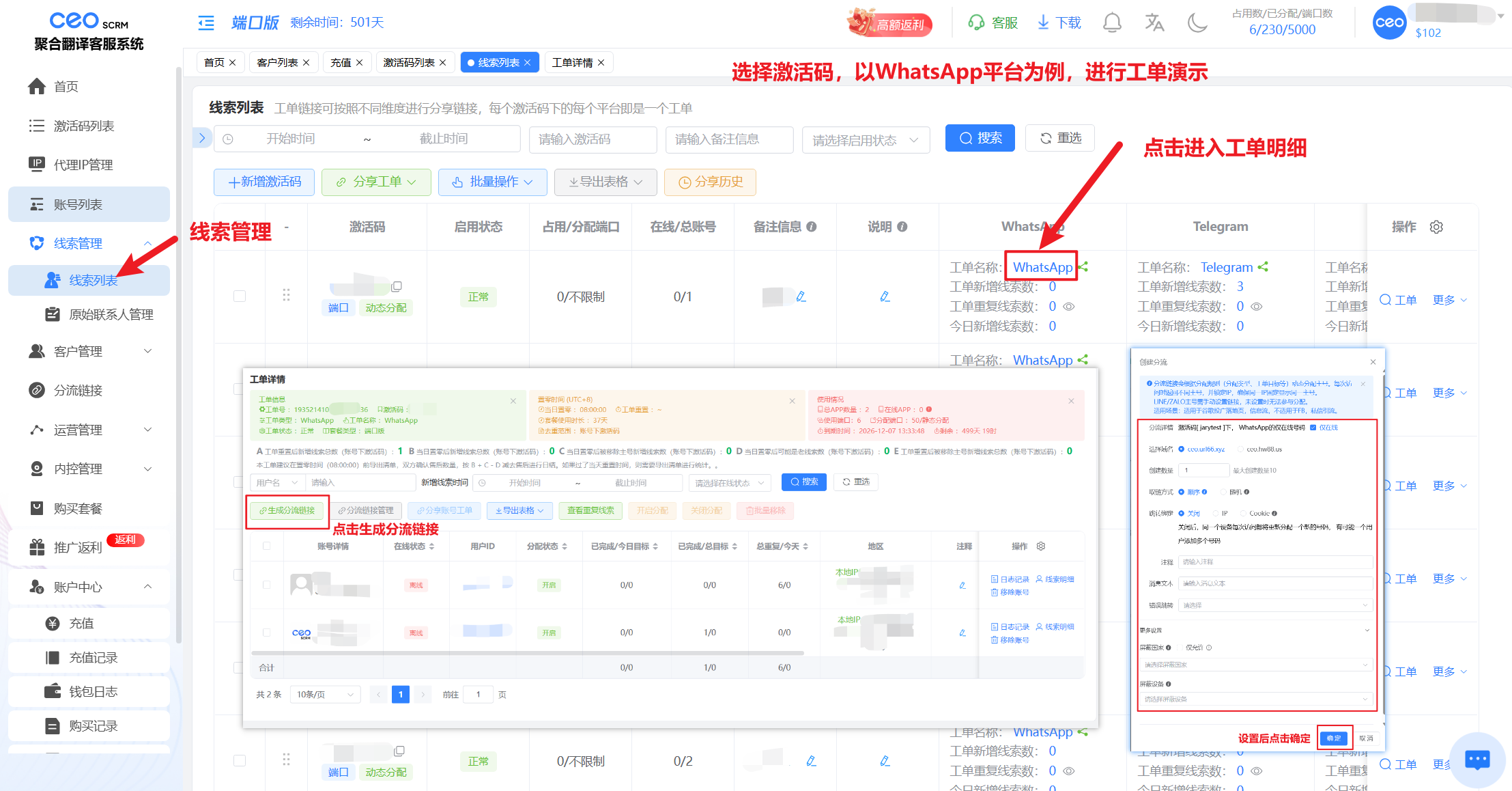 用于双方查看账号的新增线索情况、结算。点击 【 线索管理 】 → 进入 【 工单名称】 → 点击 【 生成分流链接 】 做链接配置。