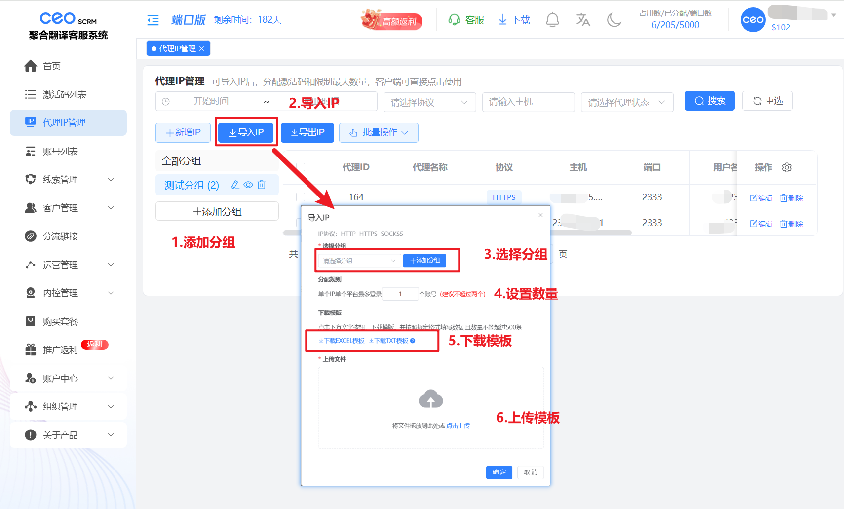 导入路径：新用户先创建一个IP分组，存放IP。打开系统后台 -【代理IP管理】- 点击【导入IP】-选择【分组】，设置分配规则，建议最多2个账号使用1个IP，下载模板，按照模板示例填写IP，导入文件后，点击确定。导入后在桌面端上号时，可以直接点击配置代理，选择导入的IP使用。