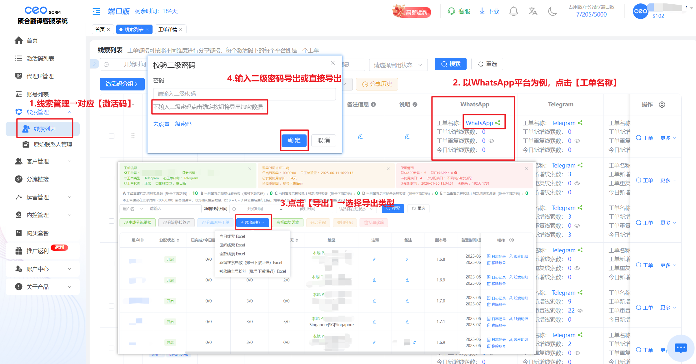 2.查看账号的线索详情，点击【导出】，导出对应数据进行查看