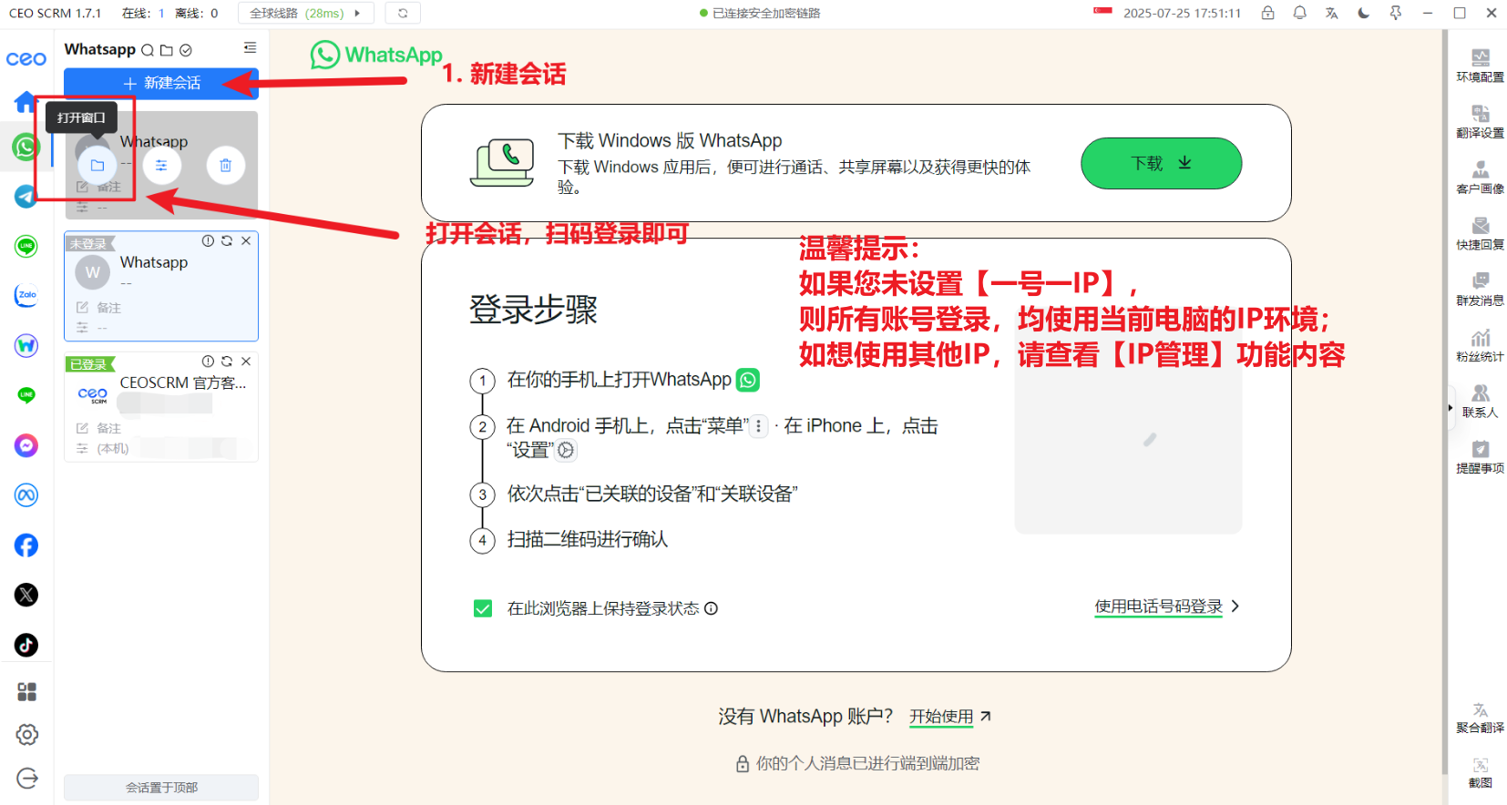以 WhatsApp 平台为例，选中左侧WhatsApp图标，进入平台 → 点击 【 新建会话 】 → 【 打开会话 】
