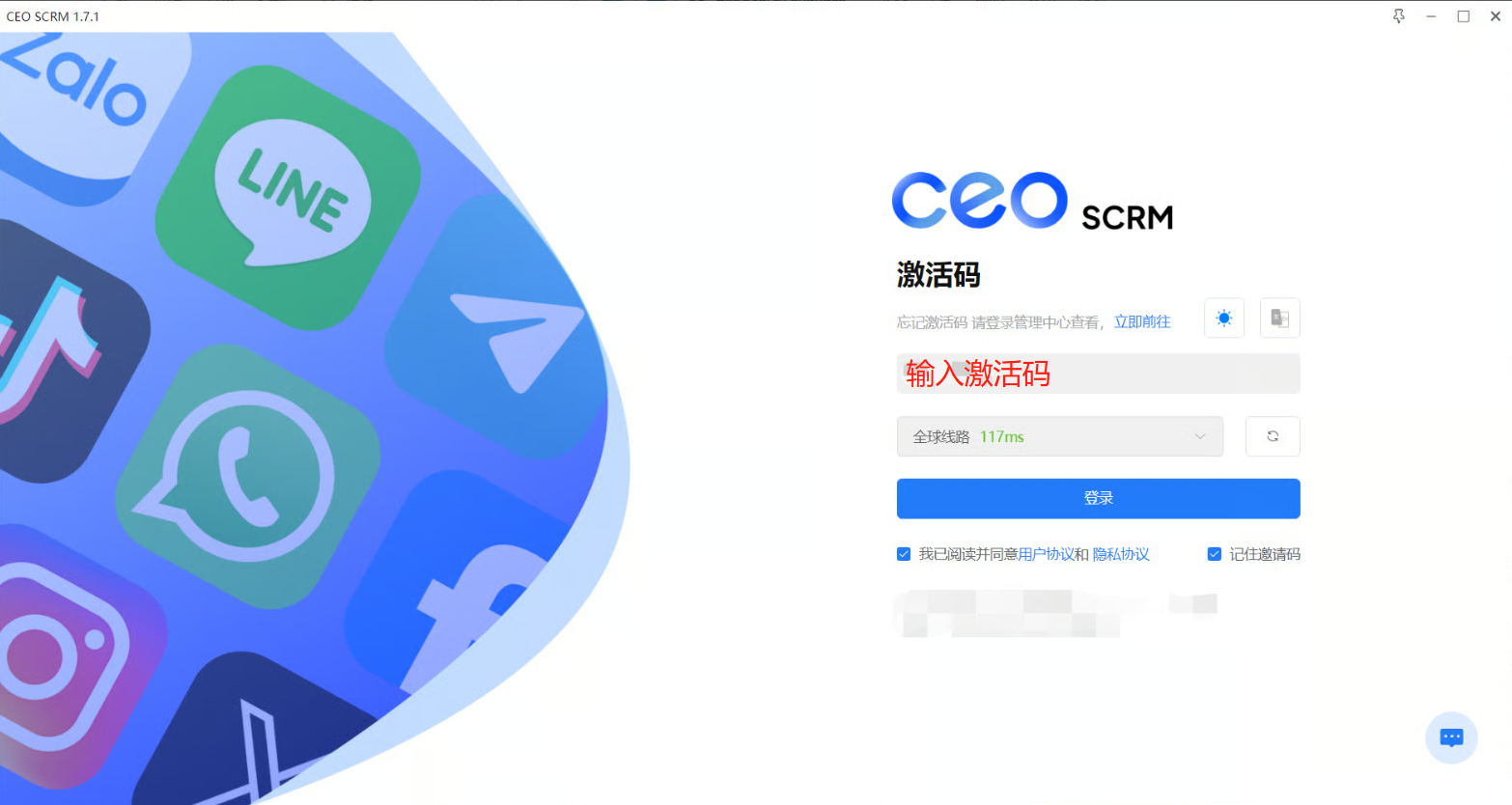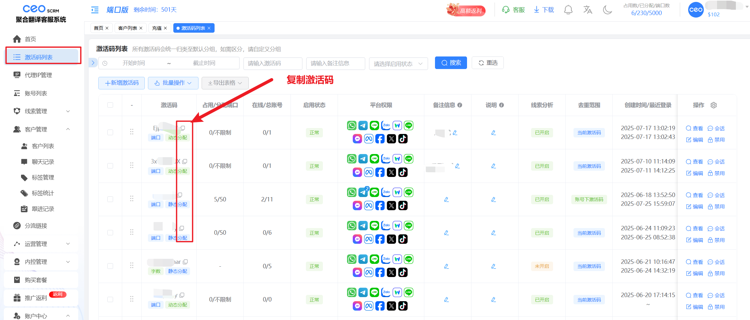 #### ①.点击 【 复制 】激活码 → 发送给 【 广告主 】 ，对方通过激活码登录CEO SCRM桌面端