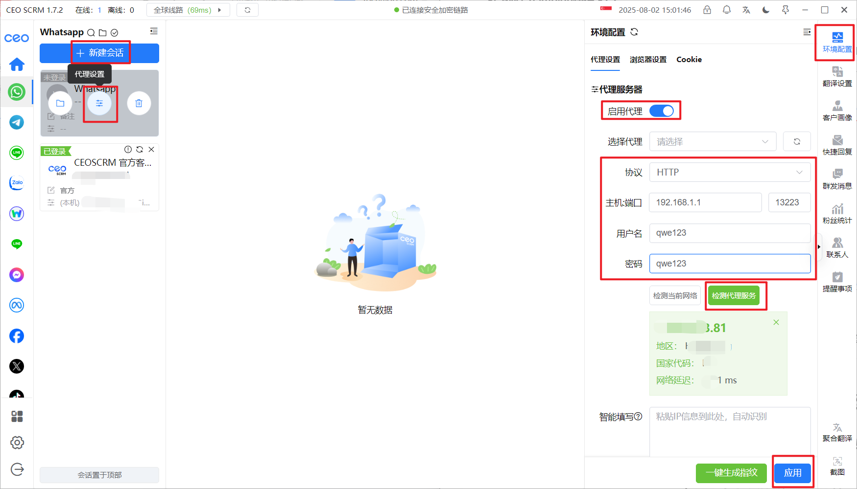 在桌面端→点击【WhatsApp】-【新建会话】→点击【设置代理】，进入IP代理设置