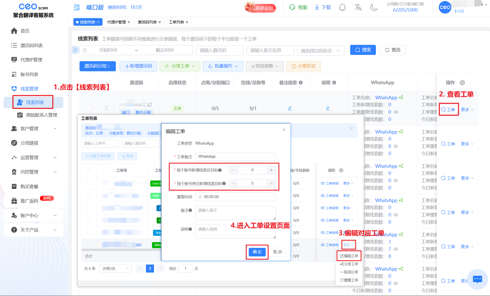 操作路径：【线索管理-线索列表】→查看对应【激活码】→点击【工单】→进入【工单页面】，以WhatsApp工单为例→点击【更多操作...】→选择【编辑工单】，进入工单设置页面