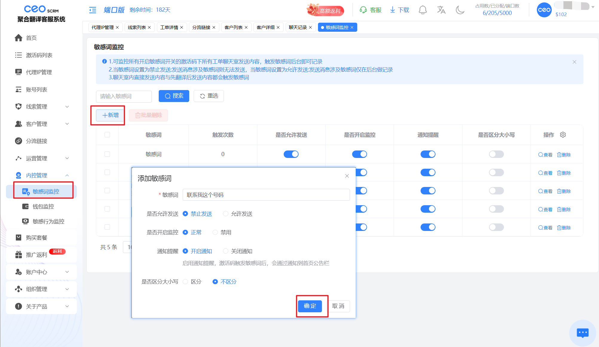 敏感词：在管理后台，点击 【 内控管理 】 → 【 敏感词监控 】 → 点击 【 新增 】 ，按需设置后点击【 确定 】&#x20;