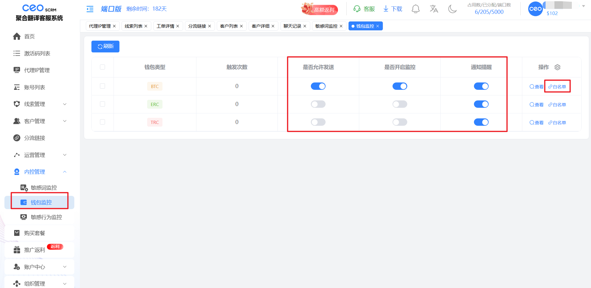 钱包监控：根据钱包类型，点击开关按钮设置，可通过【白名单】功能为不监控的地址加白
