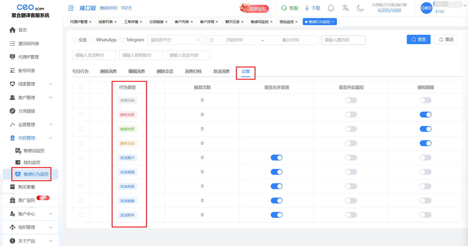 管理后台 → 点击 【 内控管理 】 → 【 敏感行为监控 】