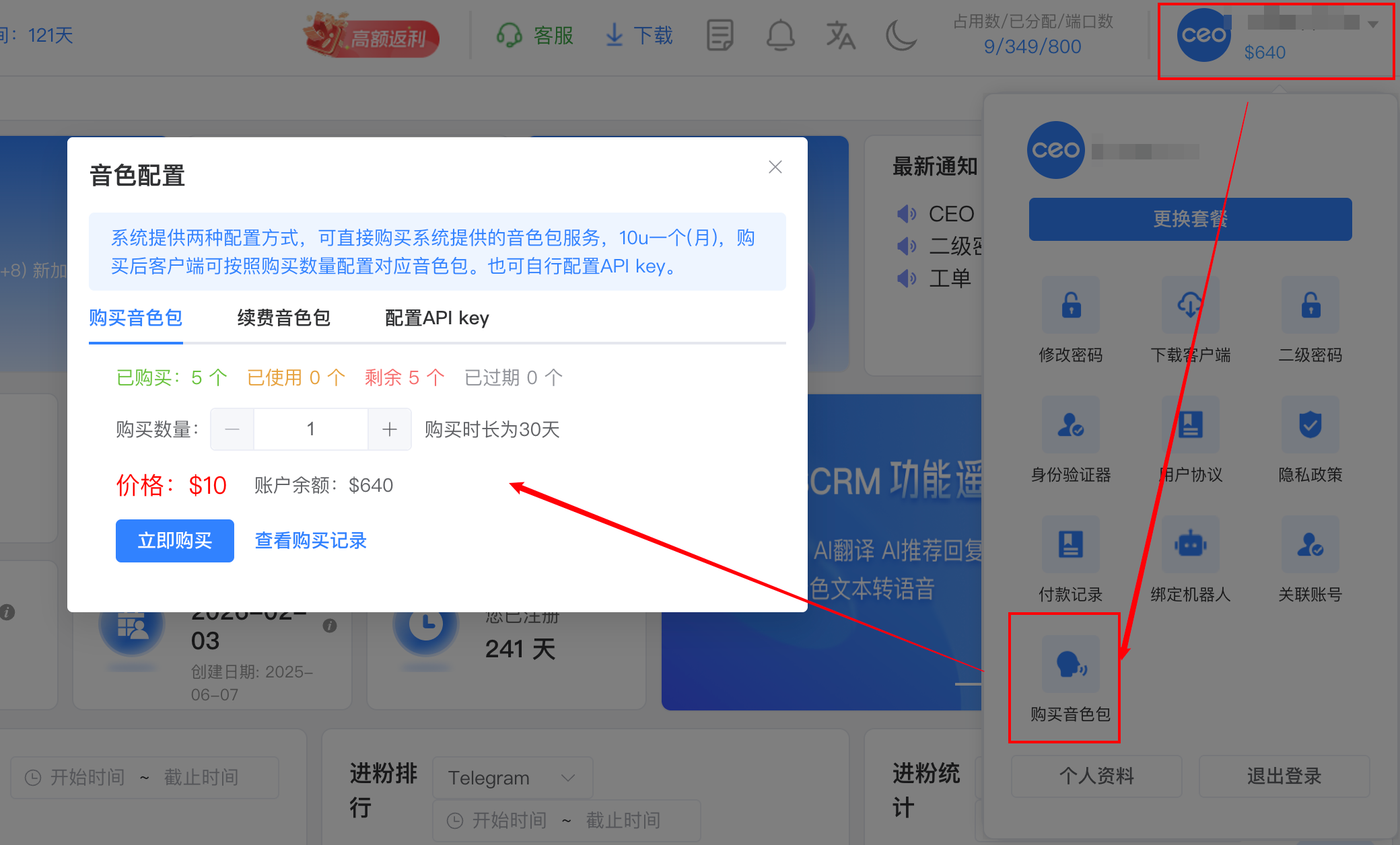 1. 购买音色包，选择数量，音色包仅支持按数量按月计费购买