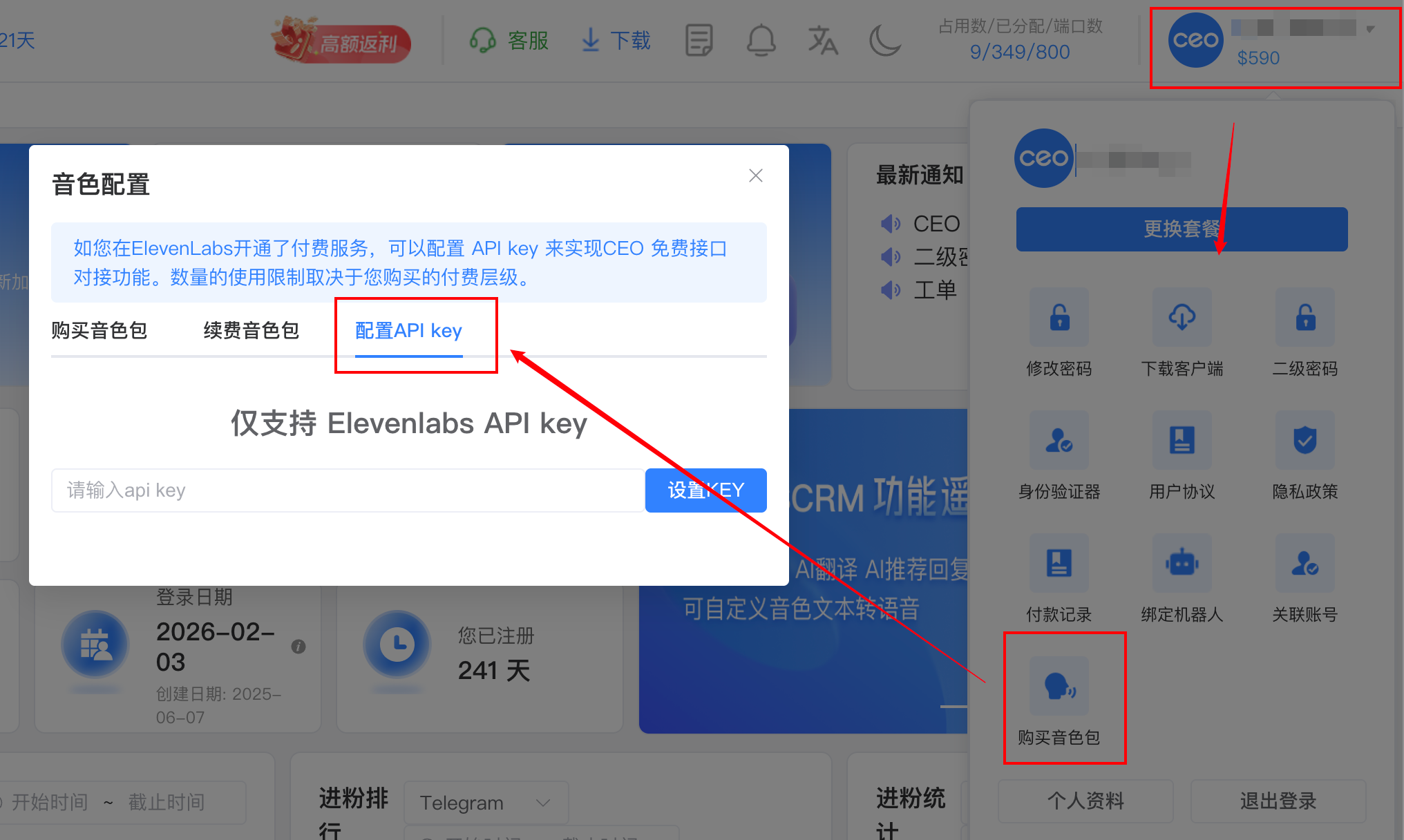 如您在**ElevenLabs**开通了付费服务，可以配置 API key 来实现CEO 免费接口对接功能。数量的使用限制取决于您购买的付费层级。