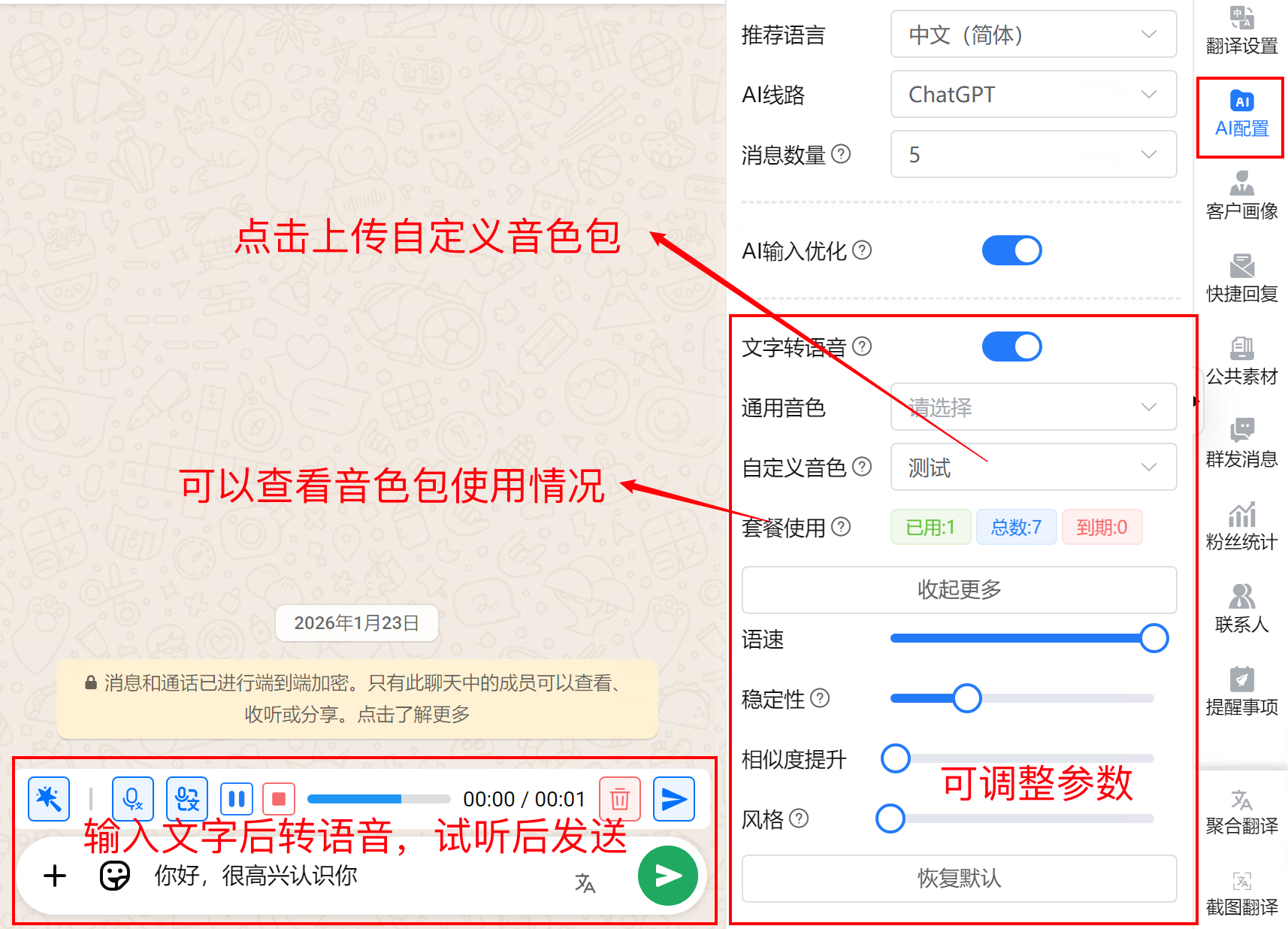 支持 WhatsApp/Telegram 文字转语音功能，通用音色端口版免费使用，自定义音色包需单独购买。