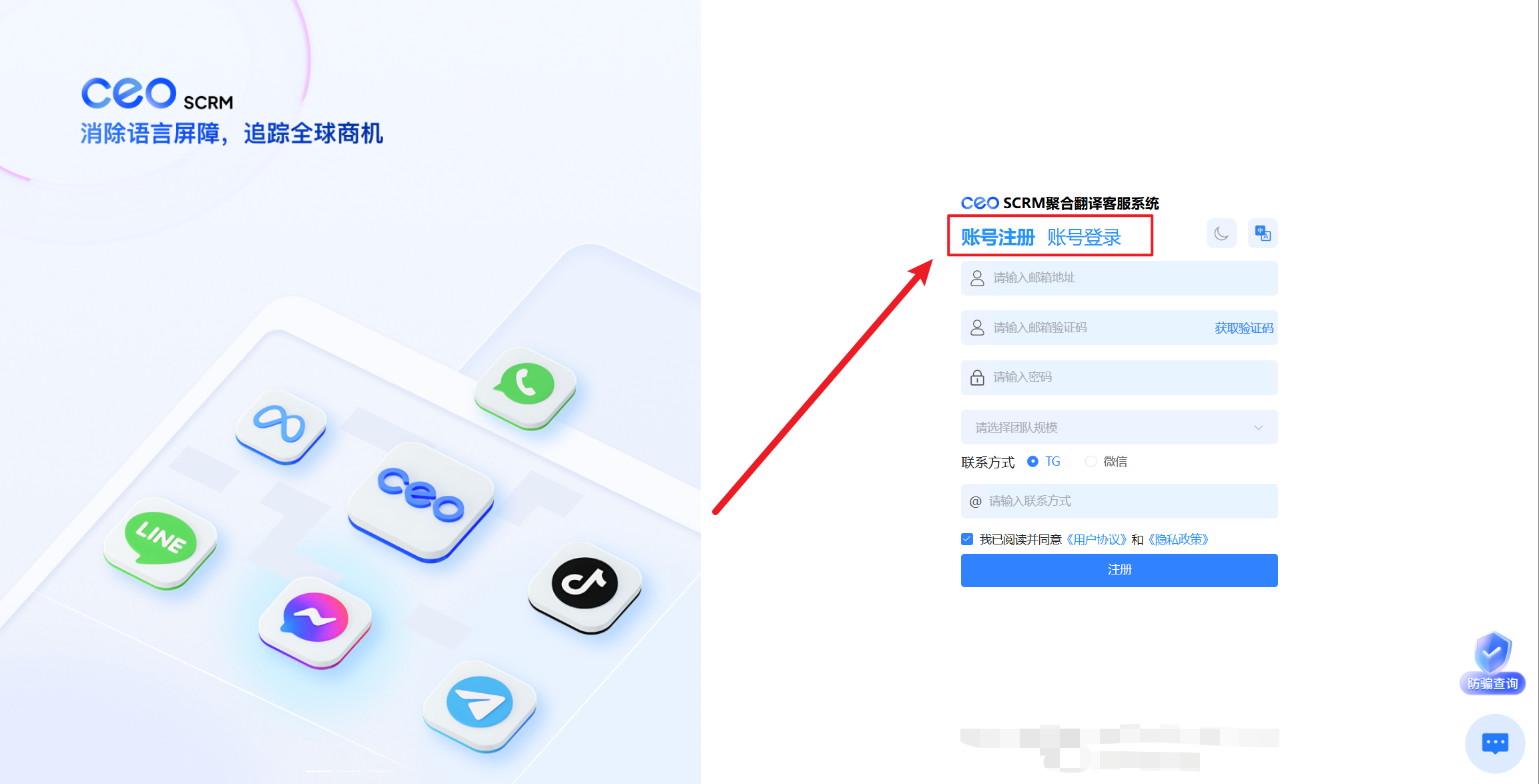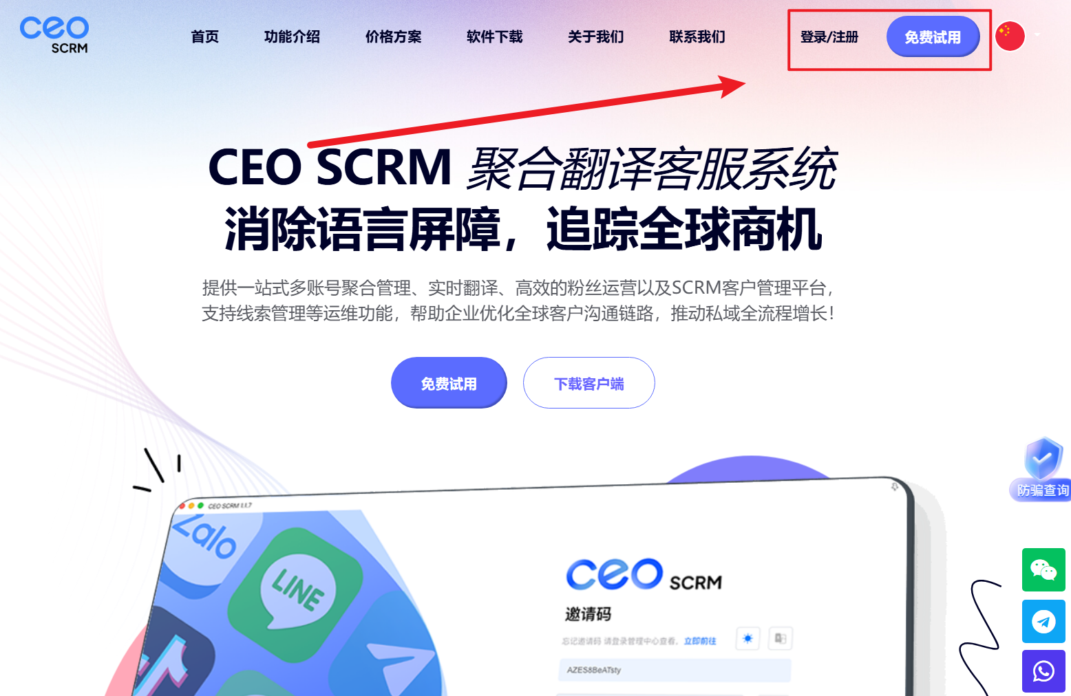 在官网点击【登录】、【免费试用】，进入注册CEO SCRM系统账号页面