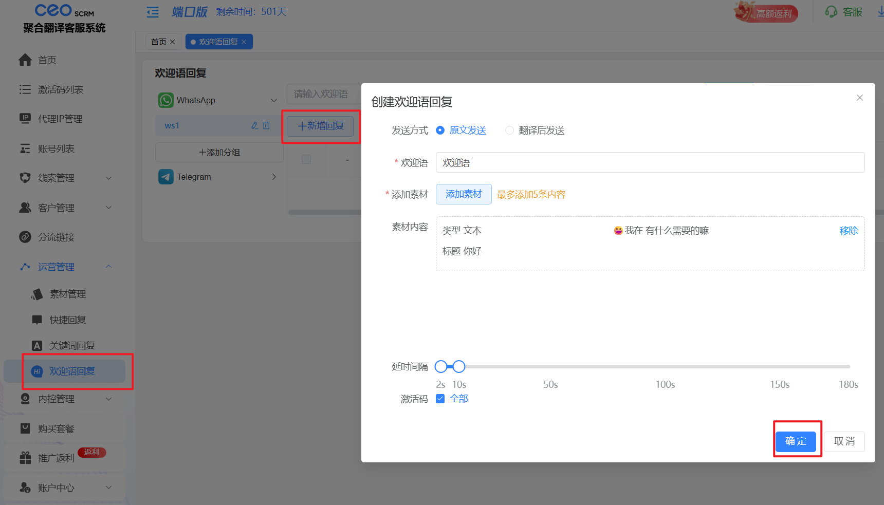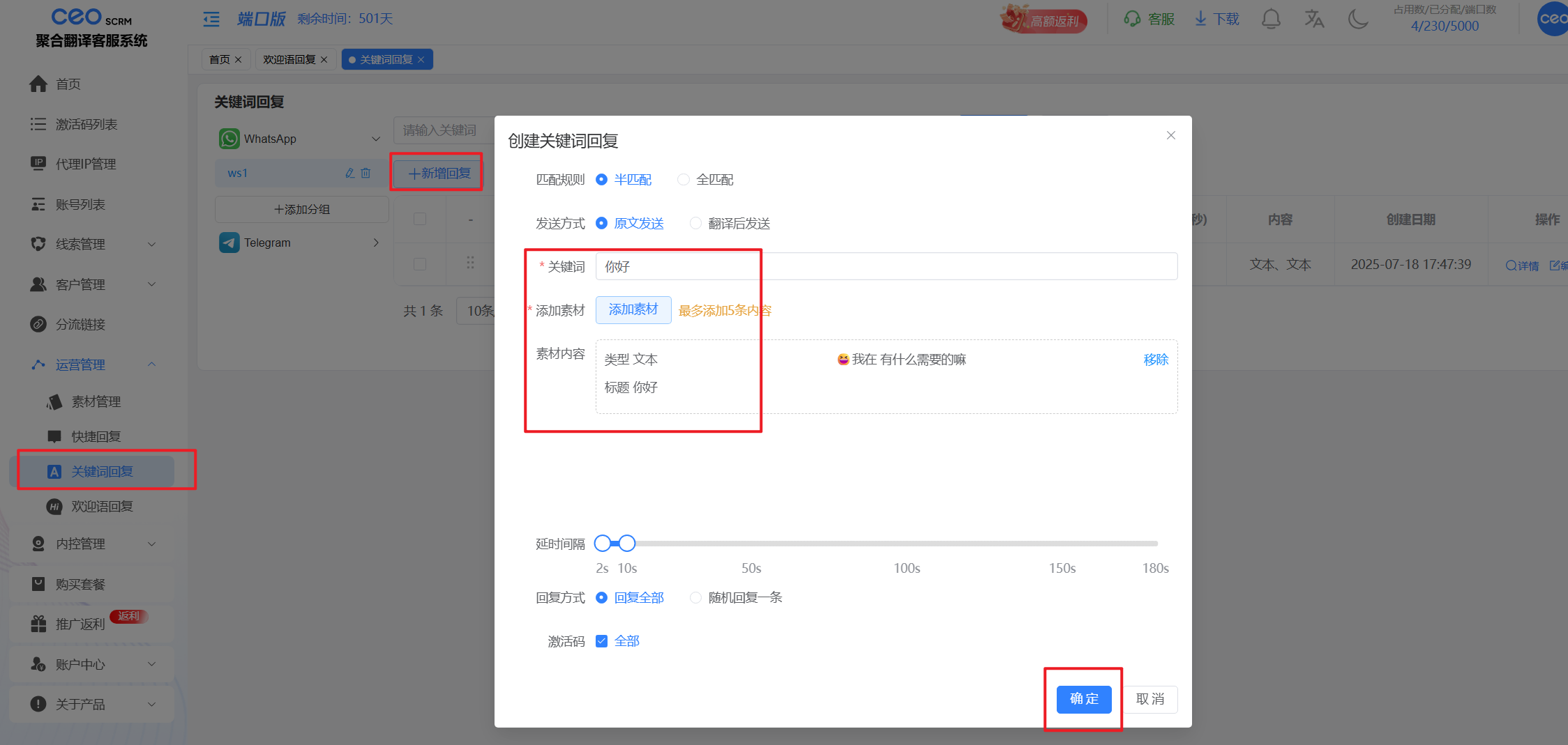 3、录入关键词和欢迎语回复的内容，并可以设置其他规则；录入的词条可以在列表中，根据【状态】关键字，由员工自定义启用或停用。