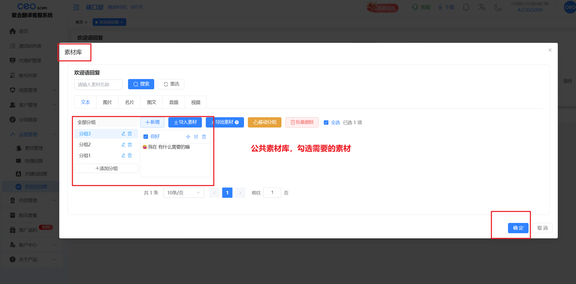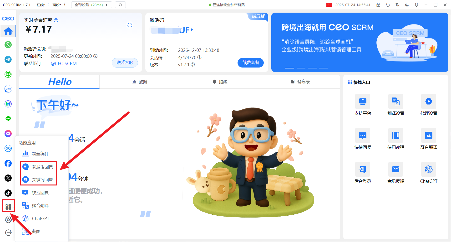 1、登录CEO SCRM客户端，选择【关键词回复】或者【欢迎语回复】