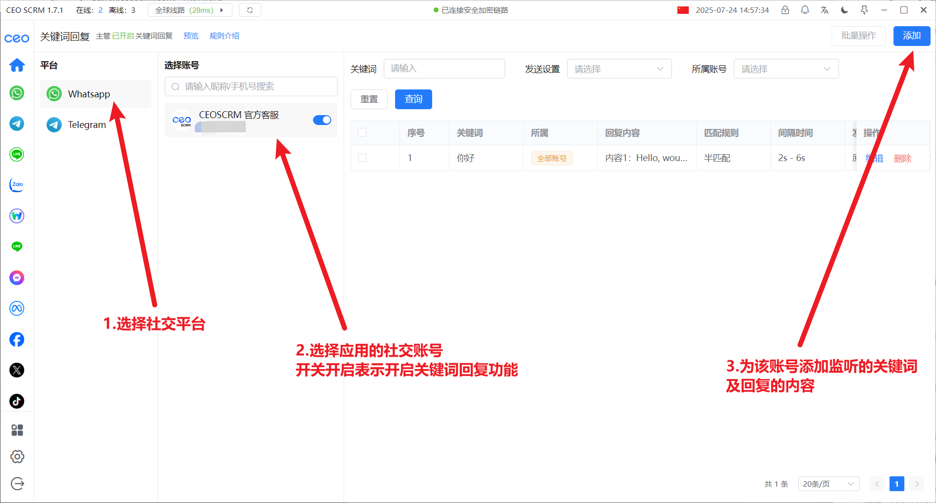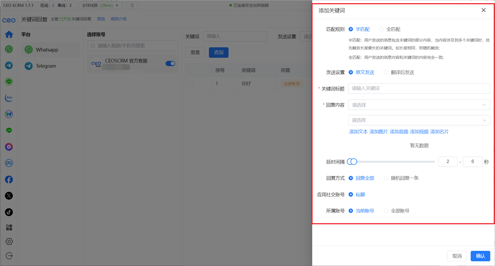 2、选择社交平台和社交帐号，添加关键词和回复的内容