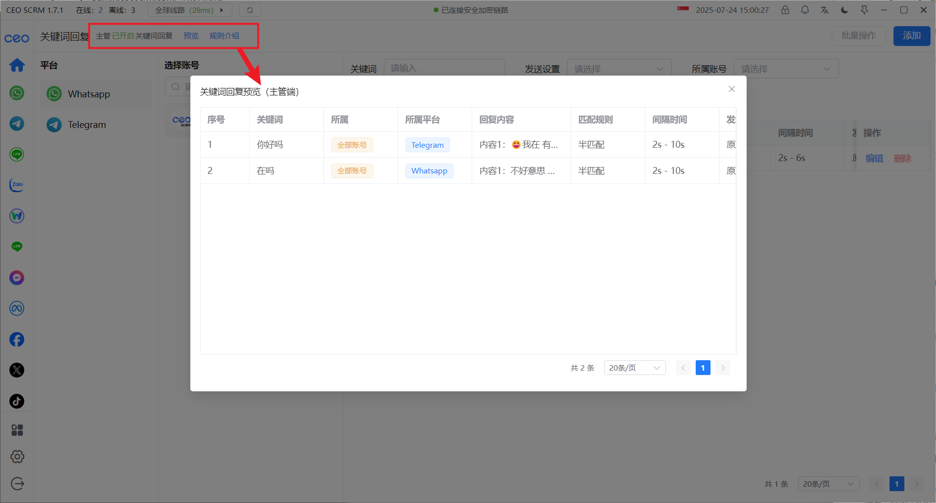 <mark style="color:red;">**2.主管设置关键词：检测客户发送句子中的关键词并做自动回复**</mark>